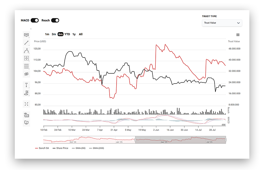 Unlock untapped alpha from public narratives, media shifts, and perception swings across millions of global sources. Trust is not a soft metric—it is a forward-looking signal. Corporate reputation, as reflected in news media, increasingly drives valuation, risk exposure, and long-term performance.