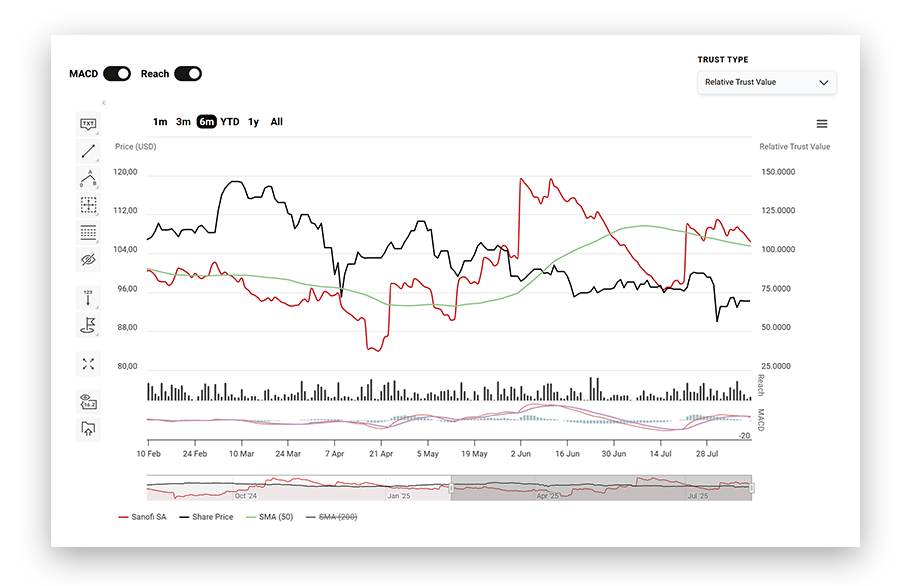 Atlastic is built for quant teams, delivering clean, structured media perception data to uncover narrative patterns, test hypotheses, and build proprietary signals at scale. With full analytical flexibility, users can quantify narrative momentum, link shifts in trust and perception to market outcomes, and backtest signals across time and entities.